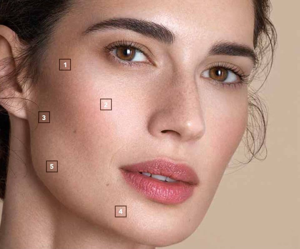 Η ένεση του Profhilo γίνεται στις ακόλουθες περιοχές και στις δύο πλευρές στις παρακάτω περιοχές του προσώπου: