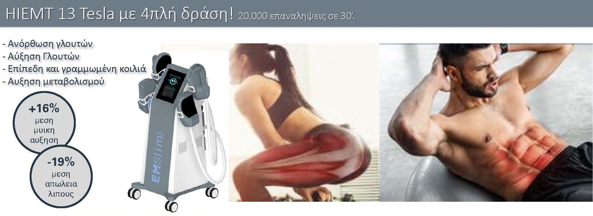 Είναι η μοναδική μη επεμβατική συσκευή παγκοσμίως που αυξάνει τη μυϊκή μάζα και ταυτόχρονα μειώνει το λίπος. Πρόκειται για την πιο σύγχρονη και επαναστατική μέθοδο στον τομέα της τεχνολογίας που επιτυγχάνει διαμόρφωση του περιγράμματος του σώματος χωρίς νυστέρι.